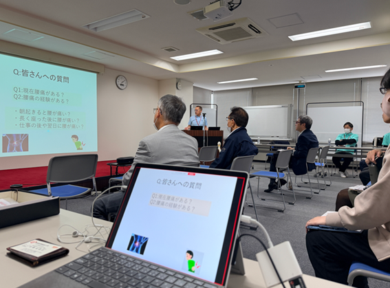 セミナーは2部構成で行われ、第1部では腰痛の特徴や予防対策についての講話、第2部では姿勢や歩行の評価を通じた個別指導が実施されました。