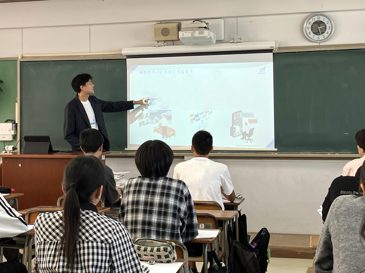 当社は成長戦略室の社員より、IT業界の魅力や可能性について講演を行いました。普段使用しているスマートフォンを切り口に、ITインフラやサイバーセキュリティの重要性、AIおよびデバイスの進化などを紹介し、未来を担う高校生の皆様に向けてメッセージを発信いたしました。